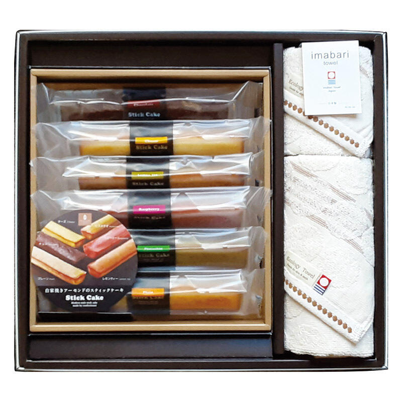 【セット内容】フェイスタオル(34×80cm)・ウォッシュタオル(34×35cm)・スティックケーキ(プレーン・チョコ・ラズベリー・ブルーベリー・チーズ・ピスタチオ・レモンティ)×各1