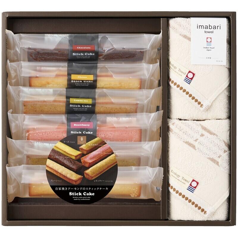【セット内容】フェイスタオル(34×80cm)×2、スティックケーキ(プレーン・チョコ・チーズ・レモンティー・ストロベリー・ピスタチオ)×各1