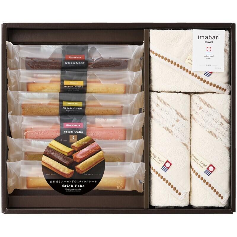 【セット内容】フェイスタオル(34×80cm)×2、ウォッシュタオル(34×35cm)・スティックケーキ(プレーン・チョコ・チーズ・レモンティー・ストロベリー・ピスタチオ)×各1