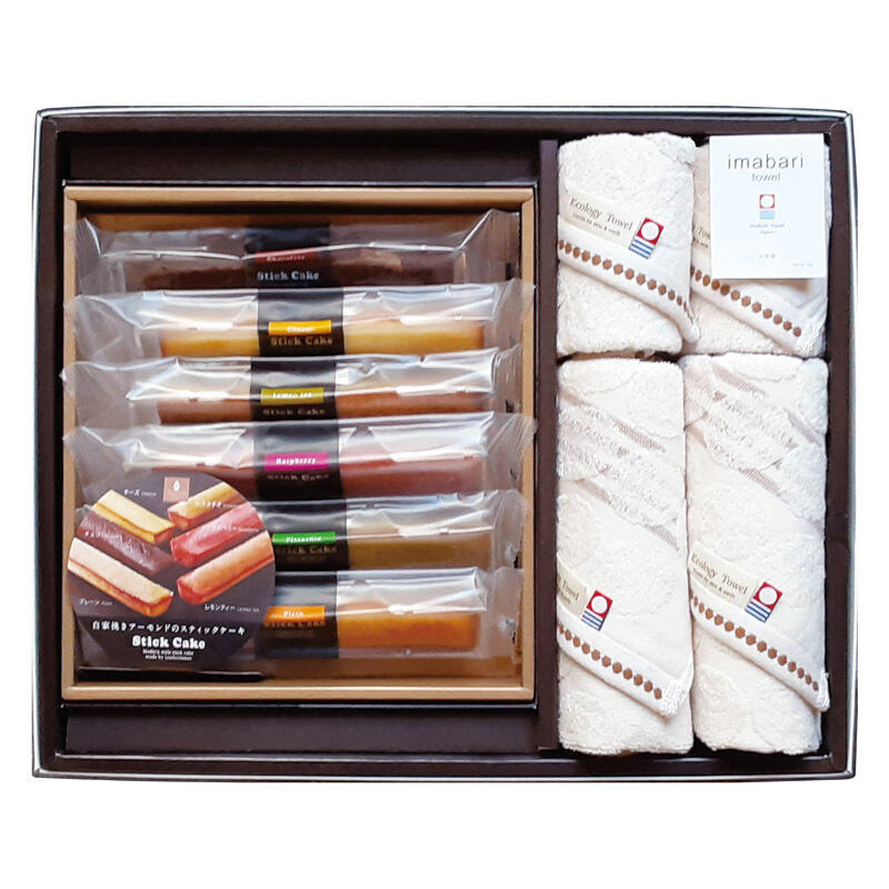【セット内容】フェイスタオル(34×80cm)・ウォッシュタオル(34×35cm)×各2、スティックケーキ(プレーン・チョコ・ラズベリー・ブルーベリー・チーズ・ピスタチオ・レモンティ)×各1