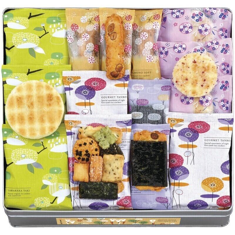 【セット内容】姫てまり梅ざらめ×9、アーモンドそふと直火炊き醤油×8、やわらか焼やき塩・兆福餅のり巻×各6、ぐるめ探訪×4