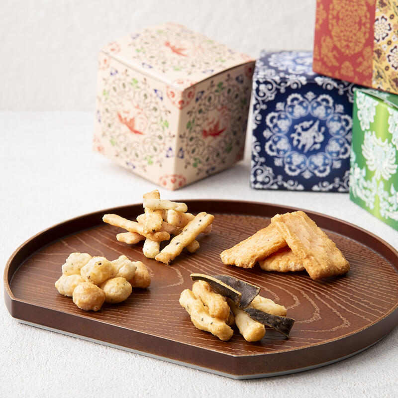 エキストラバージンオリーブオイルを使用したあられを、奈良東大寺の正倉院御物の文様をデザインした美しい箱に詰合せました。