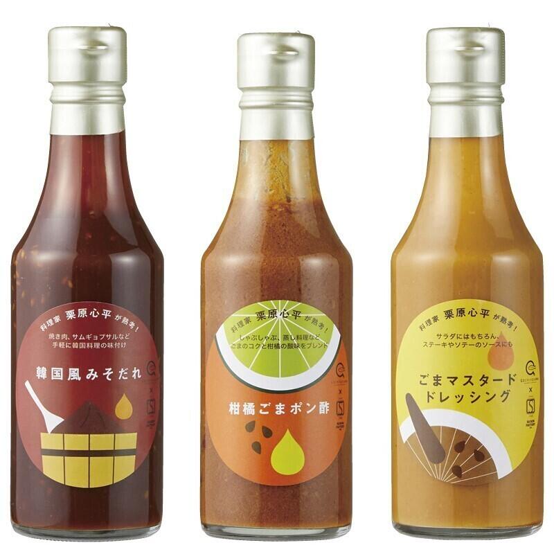 料理家 栗原心平が熟考した、ごま調味料の3本セット。焼肉・サムギョプサルなど、手軽に韓国料理の味付けができる「韓国風みそだれ」。しゃぶしゃぶ・蒸し料理など、ごまのコクと柑橘の酸味をブレンドした「柑橘ごまポン酢」。サラダはもちろん、ステーキやソテーのソースにも合う「ごまマスタードドレッシング」。手軽に本格的な味付けがかなう、こだわりの3本セット。ギフトにおすすめです!