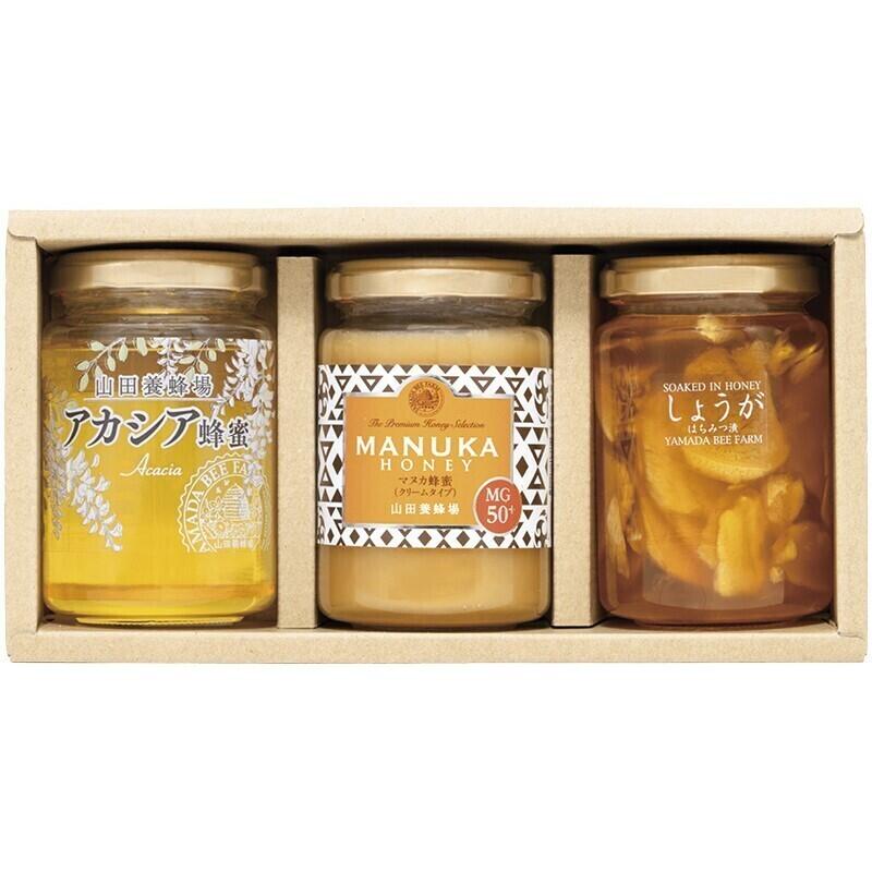 高品質なマヌカ蜂蜜や香り豊かなルーマニア産アカシア蜂蜜、さらにしょうがはちみつ漬をセットにした、贅沢な蜂蜜の詰め合わせです。