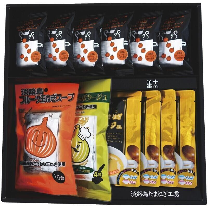 【セット内容】淡路島朝のオニオンスープ個食(7.9g)×6、金のたまねぎポタージュ(150g)×4、ZENTAの金のポタージュ(18.7g×4袋)・淡路島フルーツ玉ねぎスープ(6.2g×10袋)×各1