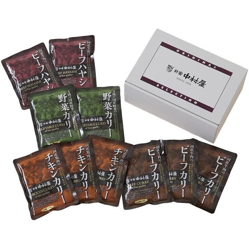 【セット内容】国産牛肉のビーフカリー・国産鶏肉のチキンカリー(各170g)×各3、4種の国産野菜の野菜カリー・国産牛肉のビーフハヤシ(各170g)×各2