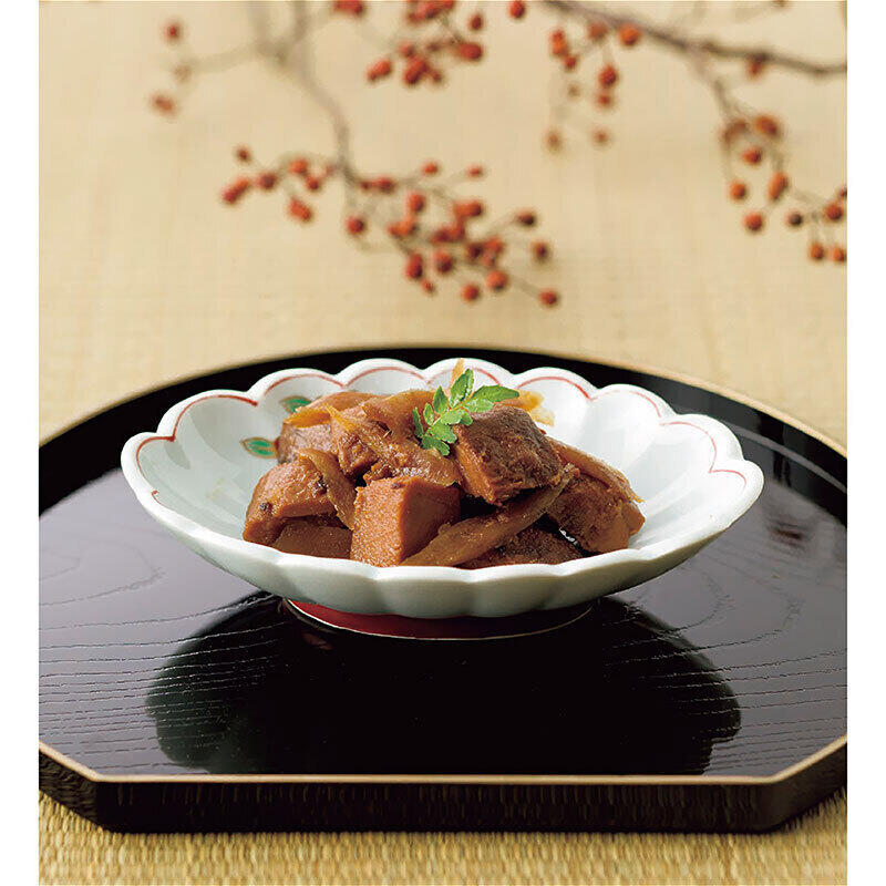 ささがき牛蒡とまぐろを炊き合せました。ふっくらしたまぐろと、しゃきっとした牛蒡の歯ごたえを愉しんでいただけます。