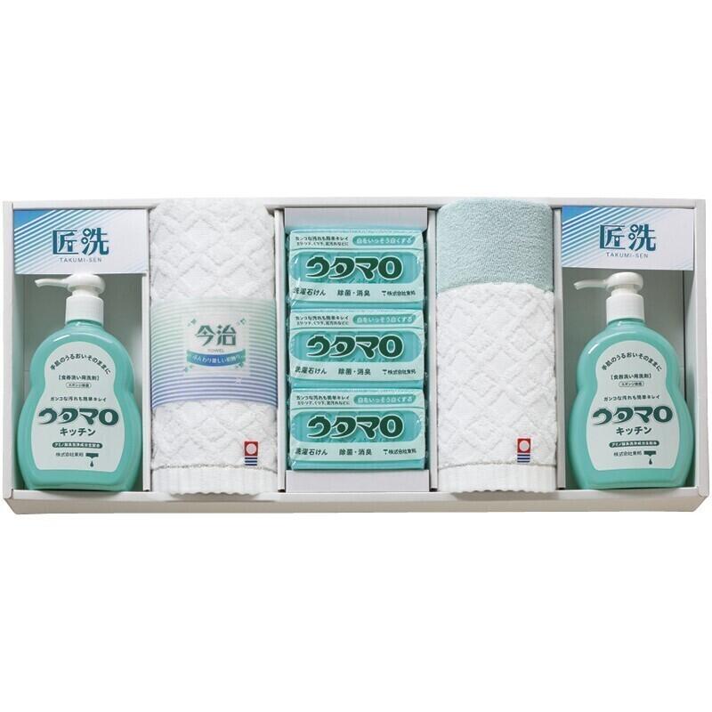 【セット内容】ウタマロ石鹸(133g)×3、ウタマロキッチン(300ml)・今治ウォッシュタオル(28×30cm)×各2、マイクロファイバークロス(中国)(25×25cm)×1