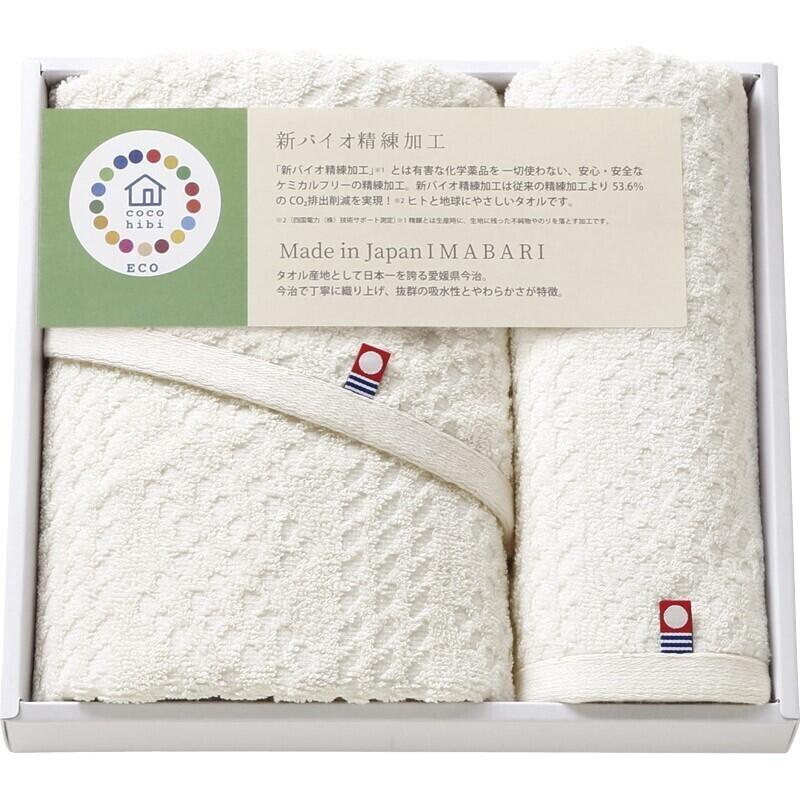 安心・安全、ケミカルフリーの『新バイオ精練加工』。『新バイオ精練加工』とは有害な化学薬品を一切使わない加工方法です。その加工は従来の精錬加工より53.6%の二酸化炭素排出削減を実現!人と地球にやさしいタオルです。