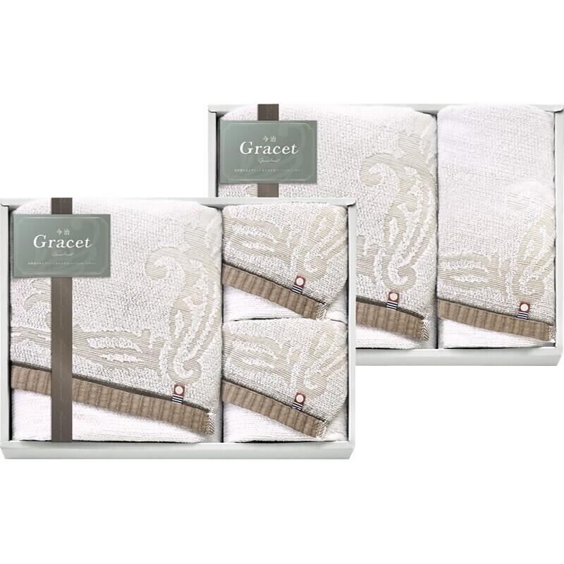 高級感のあるグレーとあたたかみのあるベージュを混ぜ合わせた、グレージュカラーのタオルセット。甘撚りの糸で織り上げ、ふんわりとした肌触りです。長い歴史の中で培われた今治のジャガード織で、ゆったりとしたオーナメント柄を繊細な曲線美で表現。優しいグラデーションにも、糸染めの業が光ります。