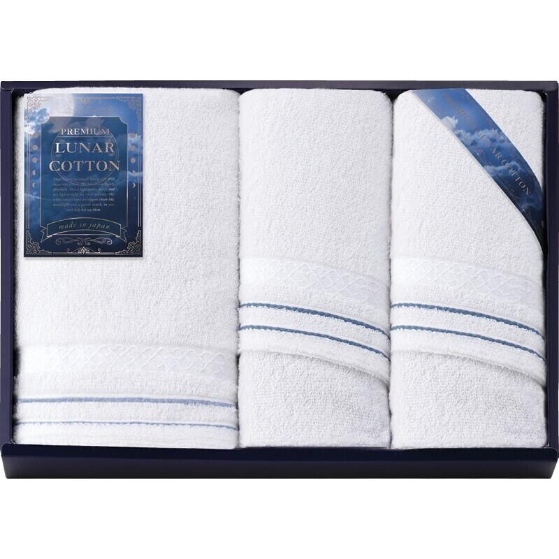 なめらかな肌触りでふわっと軽くて使いやすい。シルクのような艶のある高級な綿のピマコットンをパイル全面に使用した贅沢なタオルです。月明かりのような上品な輝きがあるタオルに、部屋を明るくする青い色糸と上品な柄をあしらいました。