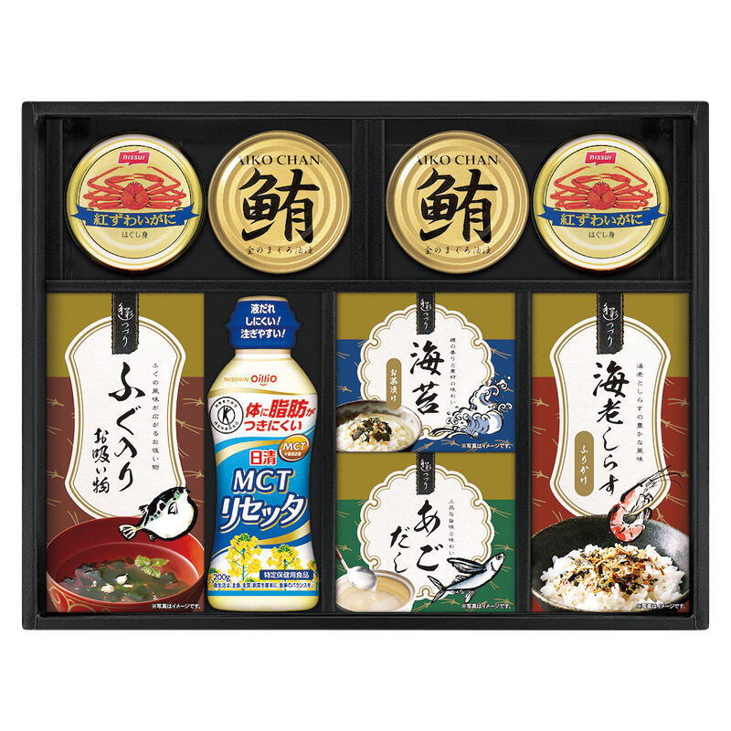 【セット内容】鮪油漬けフレーク70g・ニッスイ紅ずわいがにほぐし身55g×各2、日清MCTリセッタ200g・海老しらすふりかけ(3g×3)・海苔茶漬け(5.5g×2)・あごだし(6g×2)・ふぐ入りお吸いもの(3.2g×3)×各1