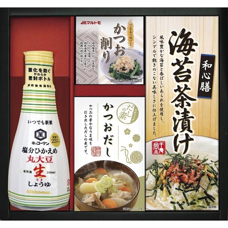 【セット内容】キッコーマン塩分ひかえめ丸大豆生しょうゆ(200ml)・海苔茶漬け(6g×5)・かね七かつおだし(4g×5)・マルトモかつおパック(0.7g×3)×各1