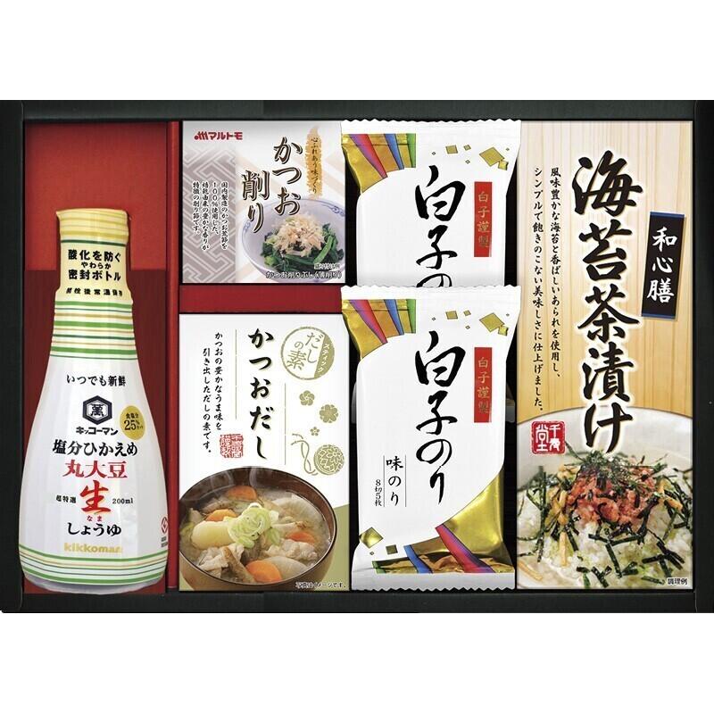【セット内容】白子のり味のり(8切5枚)×2、キッコーマン塩分ひかえめ丸大豆生しょうゆ(200ml)・海苔茶漬け(6g×5)・かね七かつおだし(4g×5)・マルトモかつおパック(0.7g×3)×各1