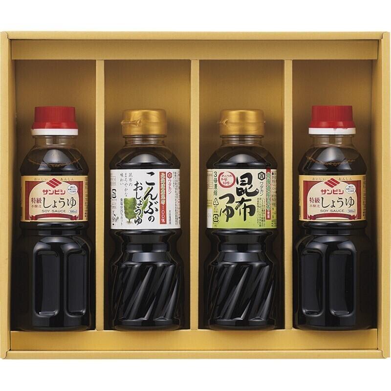 【セット内容】サンビシ特級本醸造しょうゆ(300ml)×2、ワダカン(昆布つゆ・こんぶのおしょうゆ)(各300ml)×各1