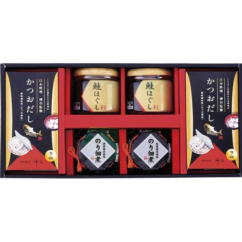 【セット内容】のり佃煮(80g)・鮭ほぐし(50g)・日本料理神谷監修かつおだし(4g×8袋)×各2