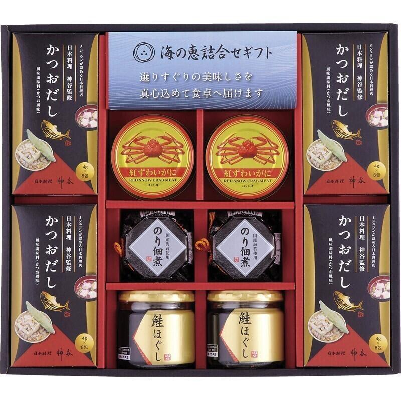 【セット内容】日本料理神谷監修かつおだし(4g×8袋)×4、のり佃煮(80g)・紅ずわいがにほぐし身(55g)・鮭ほぐし(50g)×各2