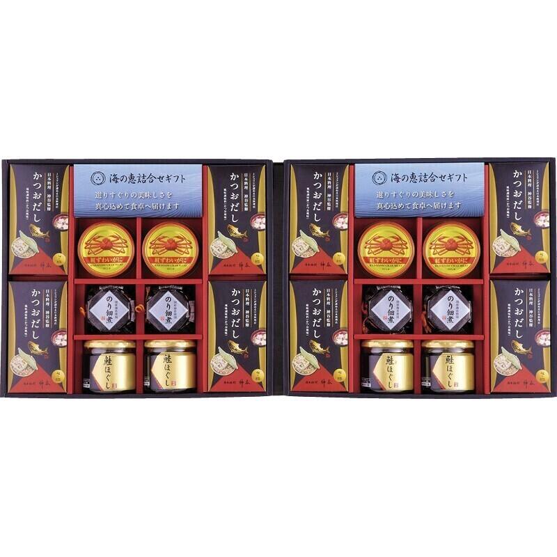 【セット内容】日本料理神谷監修かつおだし(4g×8袋)×8、のり佃煮(80g)・紅ずわいがにほぐし身(55g)・鮭ほぐし(50g)×各4