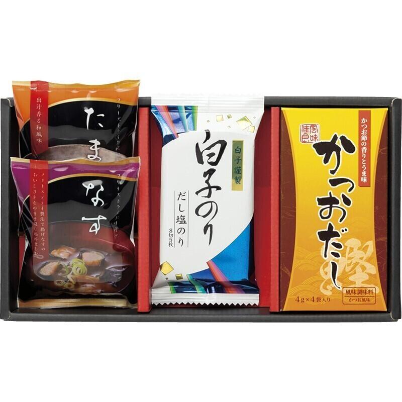 【セット内容】かつおだし(4g×4袋)・フリーズドライ(なす味噌汁・たまごスープ)・白子だし塩のり(8切5枚)×各1