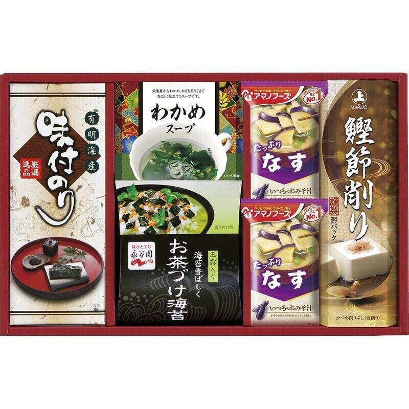 【セット内容】アマノなすおみそ汁(9.5g)×2、永谷園お茶づけ海苔(6.3g×3袋)・わかめスープ(5.3g×2袋)・まるじょう鰹節削り(1.5g×4袋)・有明海産味付のり(3切6枚)×各1