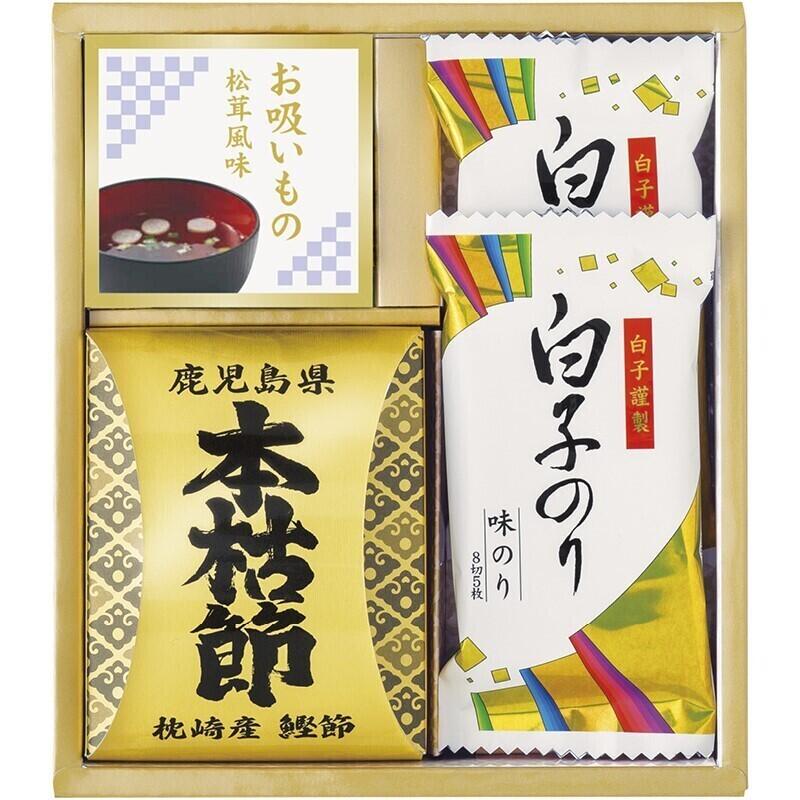 【セット内容】白子のり味のり(8切5枚入)×2、枕崎産本枯節(2.5g×2袋)・松茸風味お吸い物(2.3g×2袋)×各1