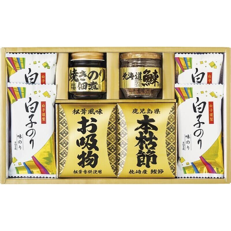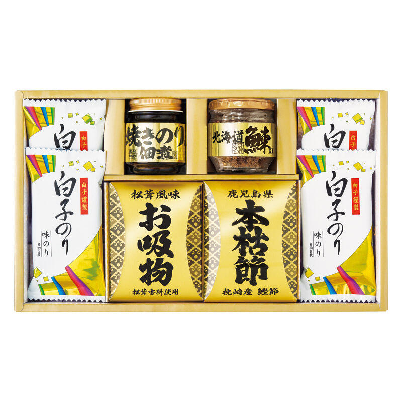 【セット内容】白子のり味のり(8切5枚入)×4、焼きのり入佃煮(85g)・北海道産鰊フレーク(50g)・枕崎産本枯節(2.5g×2袋)・松茸風味お吸い物(2.3g×3袋)×各1