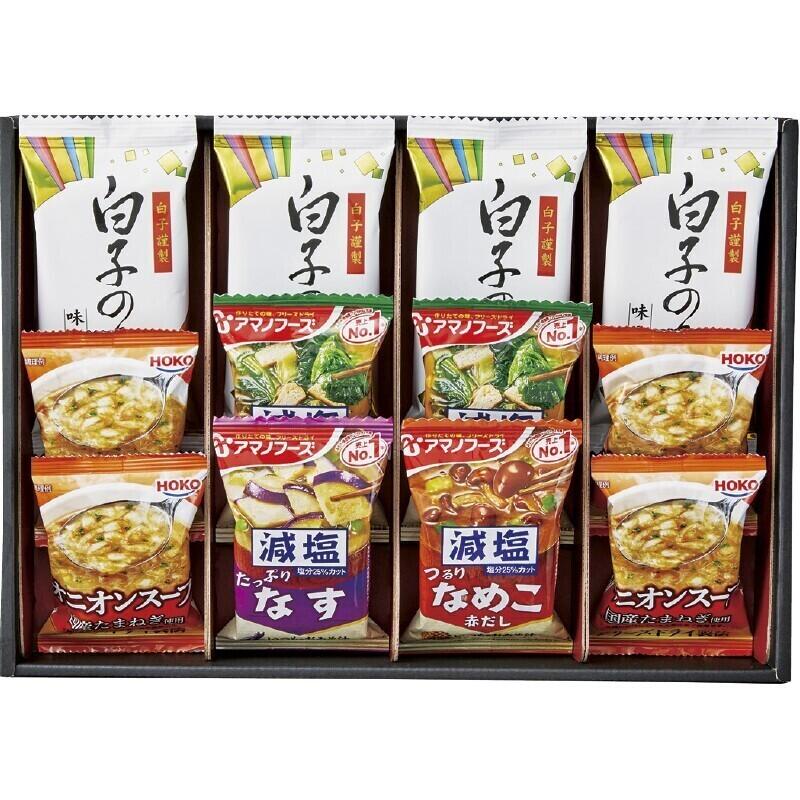 【セット内容】宝幸オニオンスープ・白子のり味のり(8切5枚)×各4、アマノフーズ減塩いつものおみそ汁(ほうれん草)×2、アマノフーズ減塩いつものおみそ汁(なす・なめこ)×各1