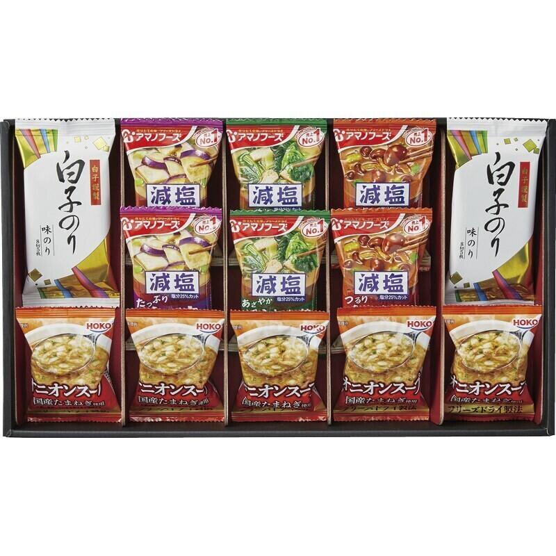 【セット内容】宝幸オニオンスープ×5、アマノフーズ減塩いつものおみそ汁(なす・なめこ・ほうれん草)・白子のり味のり(8切5枚)×各2