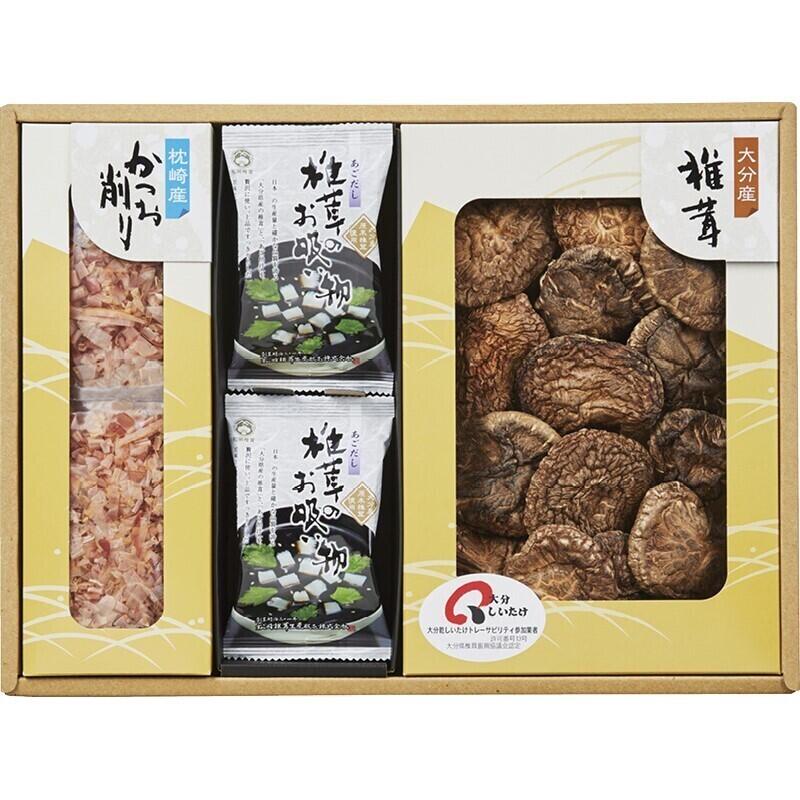 【セット内容】椎茸お吸い物(あごだし)×2、大分産原木乾椎茸こうしん(30g)・鹿児島県枕崎産かつお削りぶし(3g×6袋)×各1