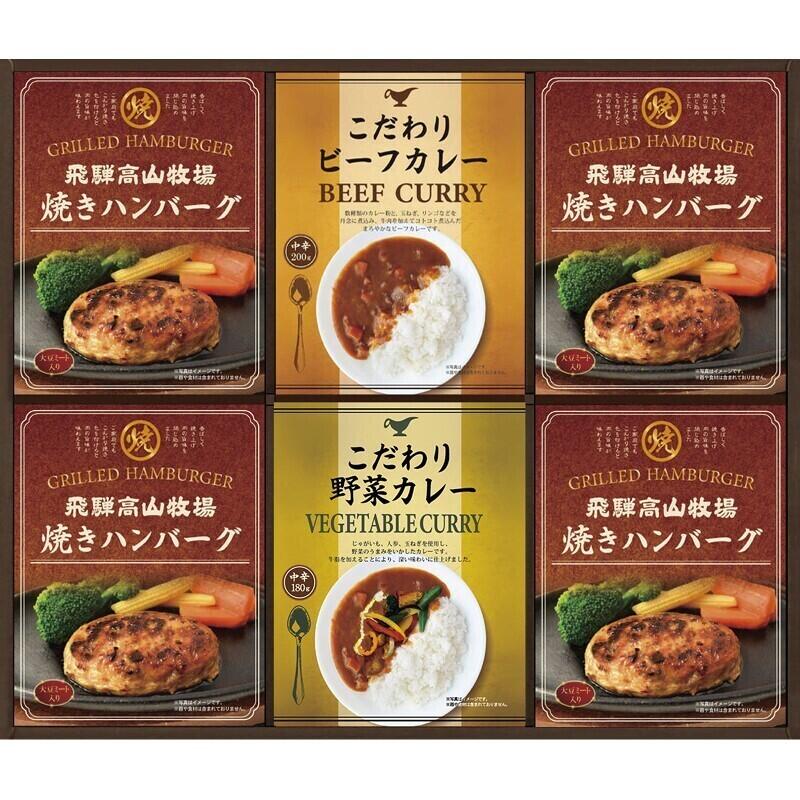【セット内容】焼きハンバーグ(100g)×4、こだわりカレー(ビーフ・野菜)(各180g)×各1