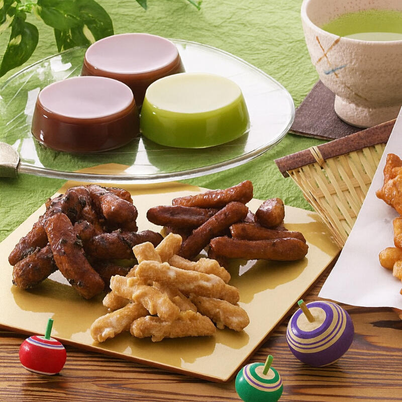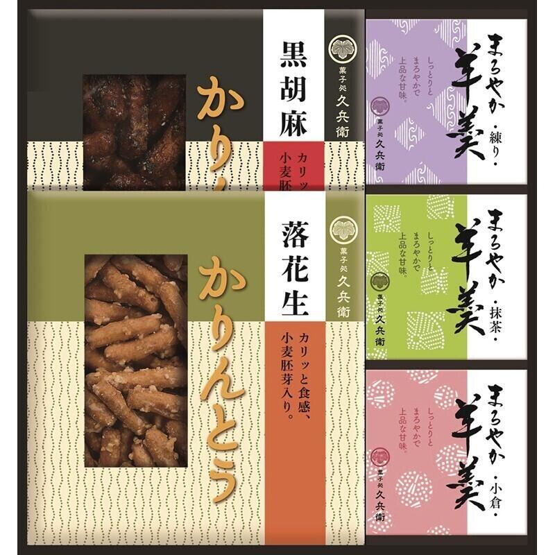 昔ながらの素朴な味のかりんとうと、夏でも冬でも楽しめるまろやか羊かんを詰め合わせました。