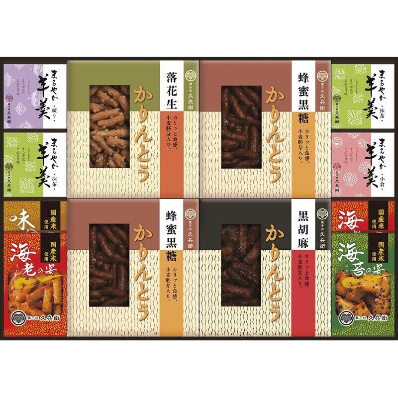 【セット内容】羊かん(抹茶)(60g)・蜂蜜黒糖かりんとう(40g)・あられ(海老)(12g)×各2、羊かん(練り・小倉)(各60g)・かりんとう(黒胡麻・落花生)(各40g)・あられ(海苔・味噌)(各12g)×各1