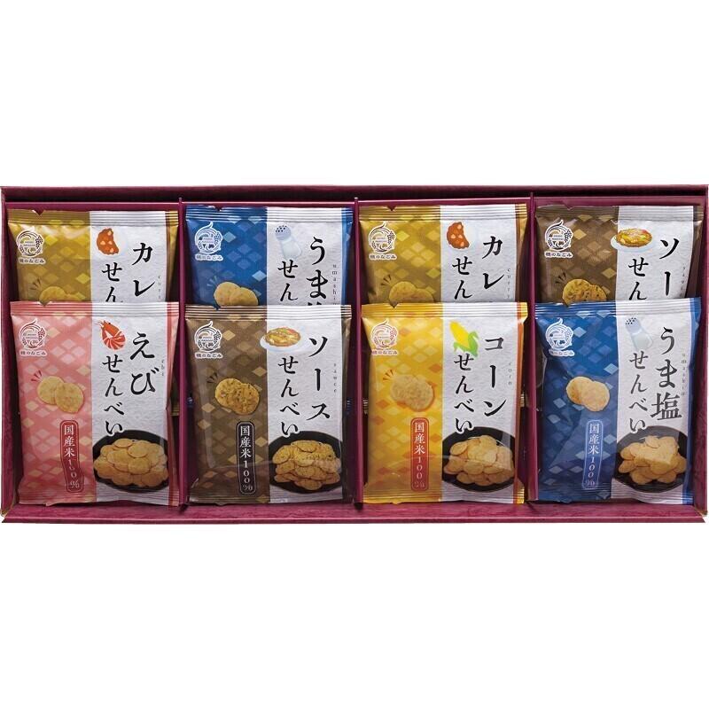 香ばしいえびの風味で後引く旨さの「えびせんべい」、香ばし醤油仕立ての「コーンせんべい」、あおさ海苔を練り込みソースの旨みを堪能できる「ソースせんべい」、シンプルな美味しさでお米を味わう「うま塩せんべい」とスパイシーなカレー風味の「カレーせんべい」をセットにした米菓詰合せです。
