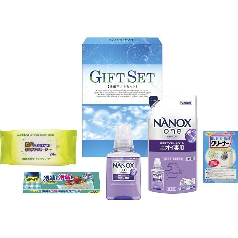【セット内容】ライオンナノックスone(380g)・ライオンナノックスone詰替用(280g)・除菌キッチンクリーナー(24枚)・洗濯機用クリーナーM・ライオンリード冷凍も冷蔵も新鮮保存バッグ(タイ)(S3枚)×各1