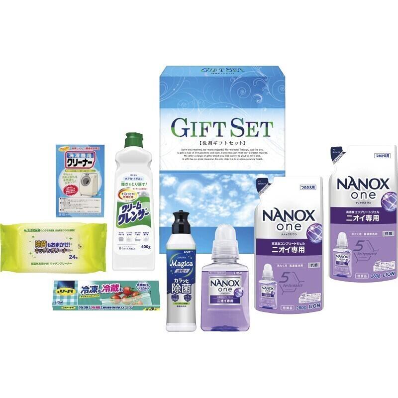 【セット内容】ライオンナノックスone詰替用(280g)×2、クリームクレンザー(400g)・ライオンナノックスone(380g)・ライオンチャーミーマジカ速乾+(プラス)(220ml)・除菌キッチンクリーナー(24枚)・洗濯機用クリーナーM・ライオンリード冷凍も冷蔵も新鮮保存バッグ(タイ)(S3枚)×各1