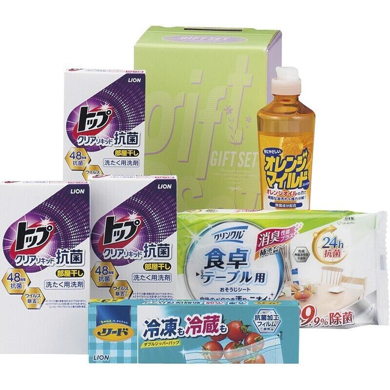 【セット内容】ライオントップクリアリキッド抗菌(25g×2袋)×3、オレンジマイルドコンパクト(270ml)・ライオンリード冷凍も冷蔵も新鮮保存バッグ(タイ)(S3枚)・クリンクル食卓テーブル用シート(30枚入)×各1