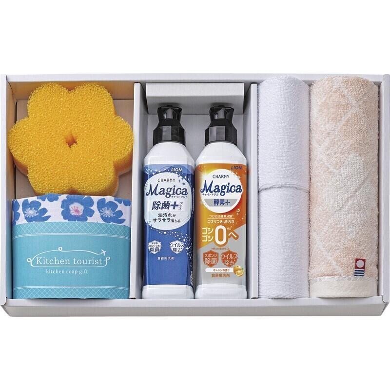 ナノ洗浄でベタつく油汚れもサラサラ落とす食器用洗剤・チャーミーマジカと、今治タオルやマイクロファイバークロスがセットになった、役立つキッチン洗剤ギフトです。かわいらしい花型スポンジとチャーミーマジカで食器洗いを楽しくサポートします。