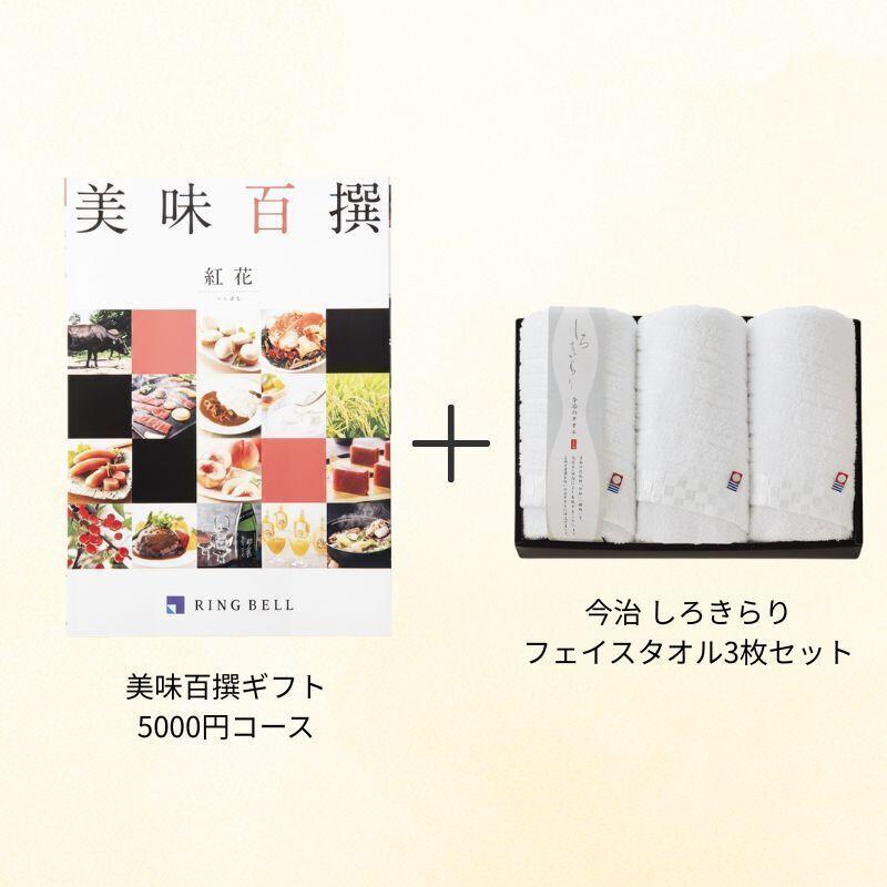 ご当地自慢の「美味」を全国から厳選したカタログギフト『美味百撰』と、日本の伝統柄『市松』と『横縞』を美しく表現した今治タオルをセットにしました。