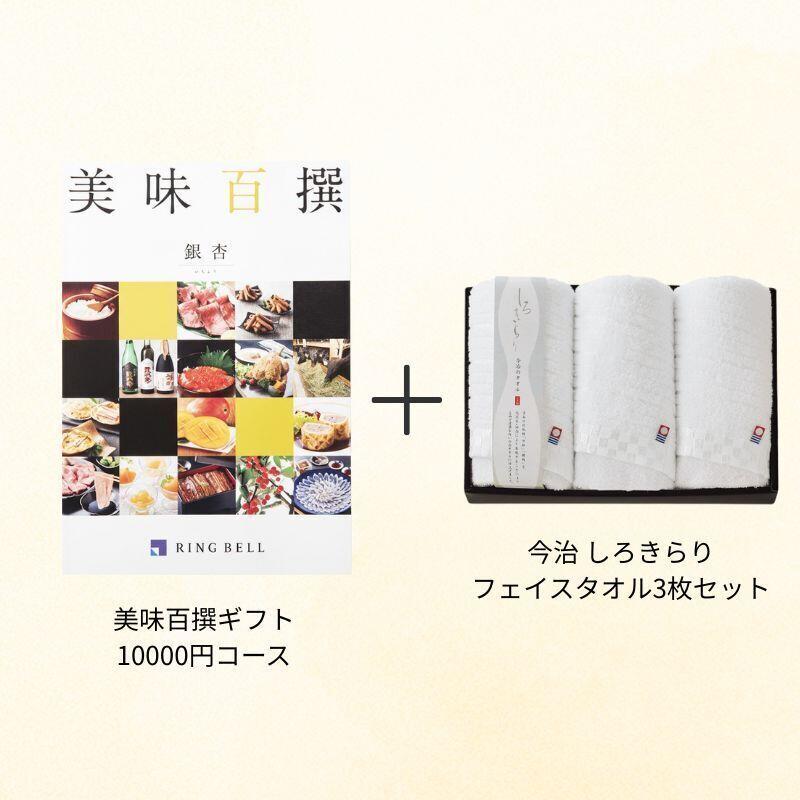 ご当地自慢の「美味」を全国から厳選したカタログギフト『美味百撰』と、日本の伝統柄『市松』と『横縞』を美しく表現した今治タオルをセットにしました。