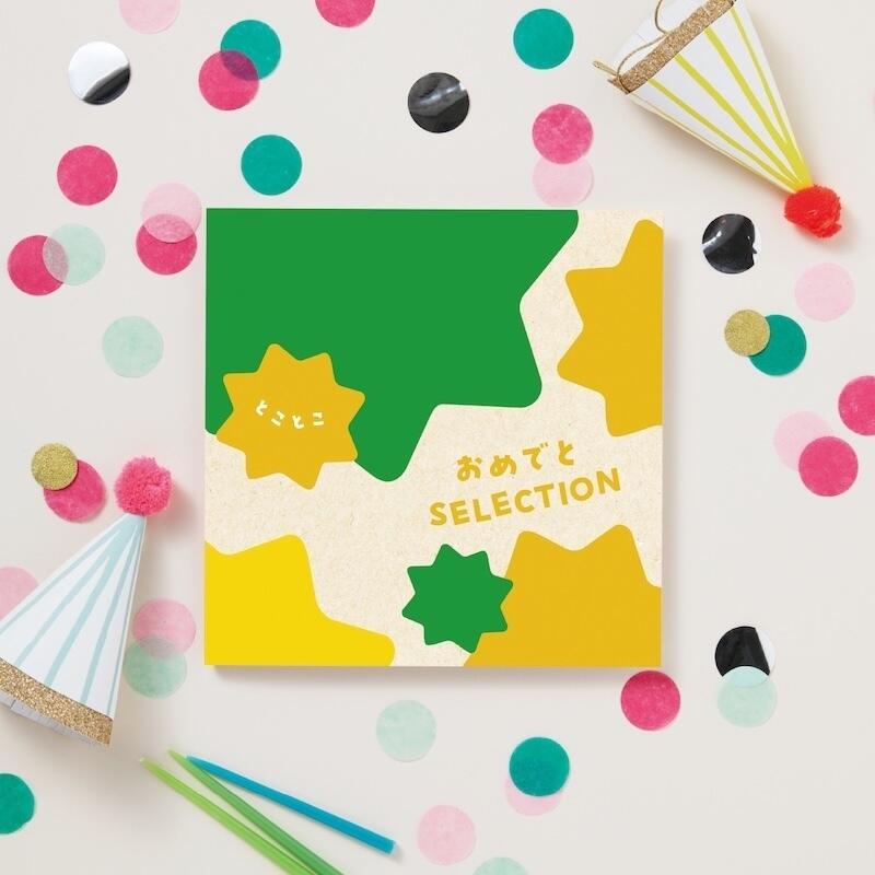 定番のベビーグッズやママパパが嬉しいアイテムなどを選べるカタログと、「おめでとセレクション」オリジナルのつみきとプレイマットがセットになったギフトです。オノマトペをモチーフにしたデザインは、ポップでかわいいだけではなく、お子さんの知育遊びをうながします。