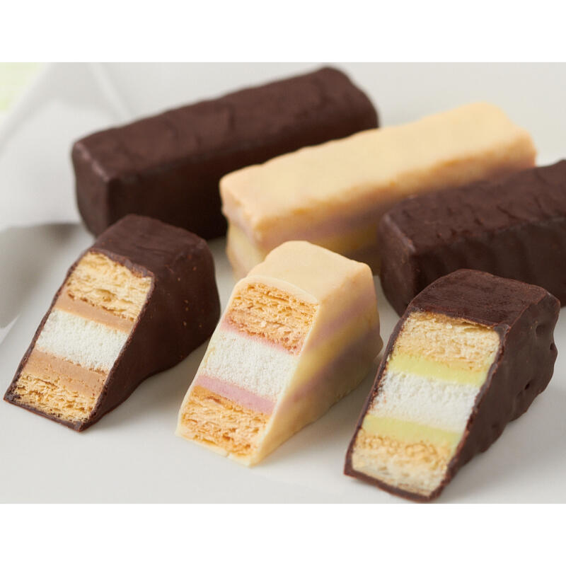 バターを使用して薄く香ばしく焼き上げた折り込みパイと、さっくり軽く焼き上げたメレンゲに、プラリネ・メロン・ストロベリーの風味豊かなクリームをサンドしました。