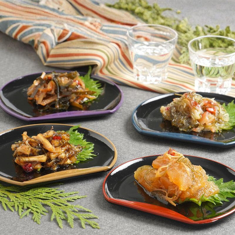 4種類の松前漬を詰め合わせた生珍味セット。数の子のプチプチとした食感が楽しめる数の子松前漬や北寄を加えた北寄松前、切干大根の歯ごたえが楽しめる切干松前。するめいかの旨味がいきたスルメ松前。