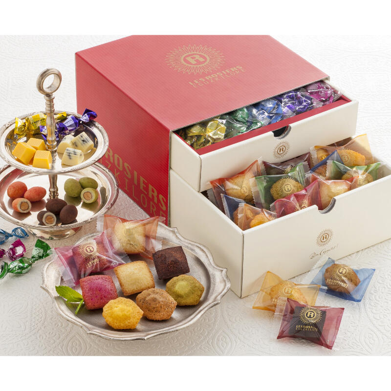 引き出しを開けると、ひと口サイズのカラフルなお菓子がたくさん!上の段にはフルーツやティラミスなどの5種類のチョコレート。下の段にはフィナンシェやマドレーヌなどの6種類の焼き菓子が。華やかなギフトボックスに仕上げました。