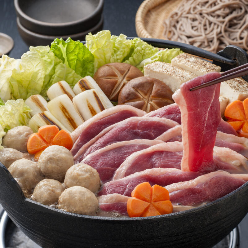 合鴨ロースとつくね、鴨だし、五割そばがセットになった鴨鍋です。お好みで野菜や豆腐などを加えてお楽しみください。使いやすい2人前ずつに分けて、お届けします。