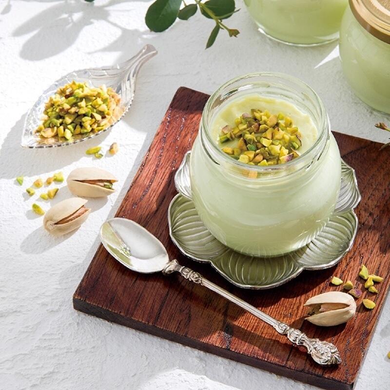 ピスタチオ専門ブランド「クイーンピスタチオ」殻を剥いたピスタチオが持つ、奥深いグリーンと上品なピンクの色ムラから醸しでる風味を活かしたなめらかなプリンにダイスクラッシュしたピスタチオをあわせて食感も楽しめるよう工夫しました。
