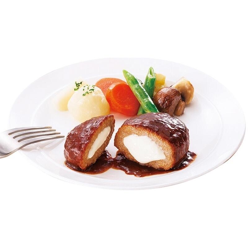 ソムリエ田崎真也おすすめ。クリームチーズ入りのハンバーグを、デミグラス・トマト・てりやきの3種のソースと合わせました。クリームチーズの爽やかな風味がハンバーグに良く合います。