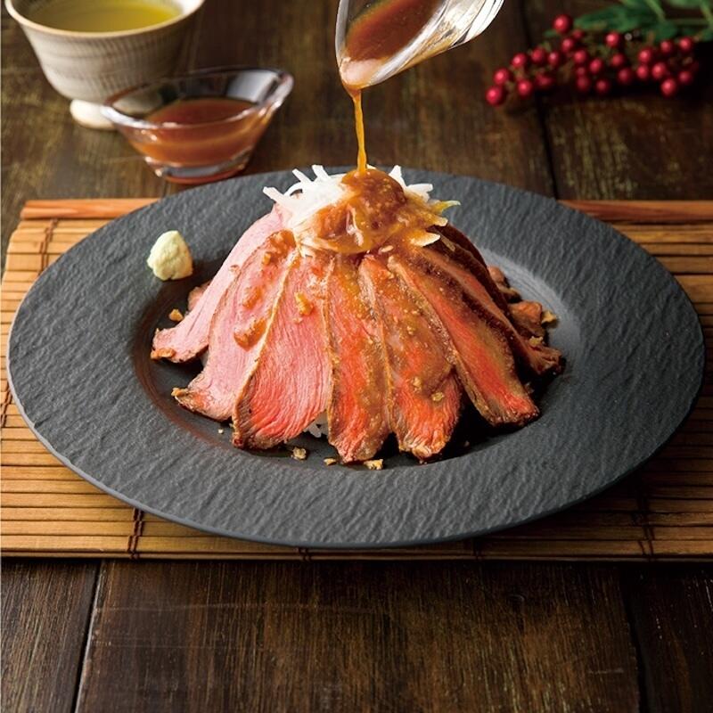 日本料理店「賛否両論」の笠原将弘が監修した和のローストビーフギフト。穀物肥育牛のサーロインを使用し、お肉の旨みを引き立てるため「焙煎黒胡椒」を程よく使用しています。