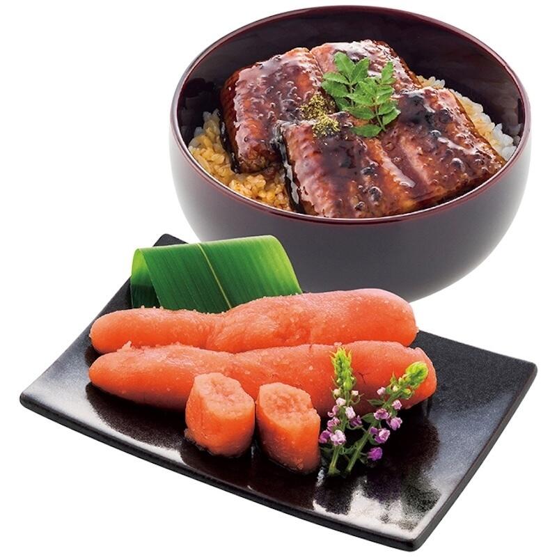 現品・内容・サイズ・材質: 辛子明太子(無着色)3~7本(約150g)・うなぎ蒲焼50g×3切・タレ・山椒各3袋