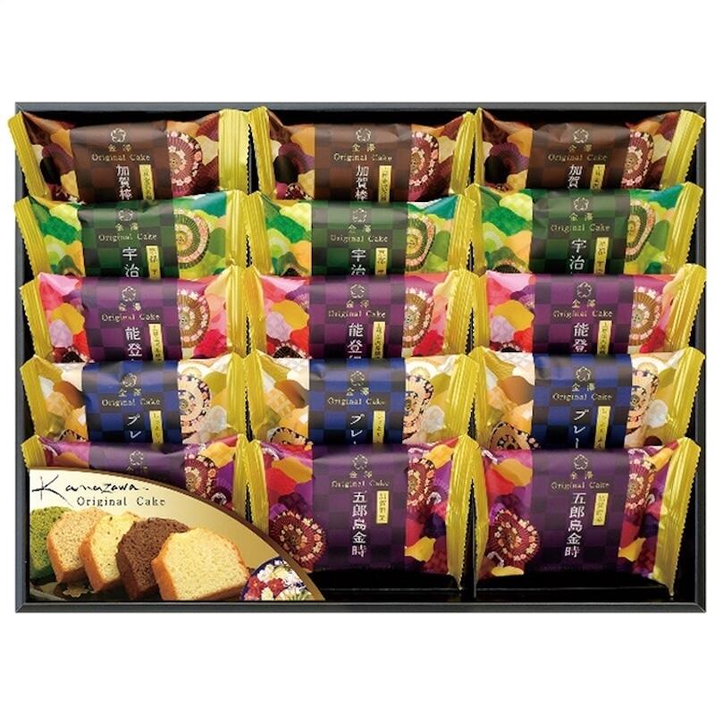 加賀野菜・五郎島金時いもを使用したほっこりしたおいしさの「五郎島金時いも」。老舗上林金沢茶舗の棒ほうじ茶を使用し黒糖で仕上げた香ばしく風味豊かな「加賀棒ほうじ茶」、しっとりふんわり食感にこだわった定番の「プレーン」、京都宇治抹茶にこだわった「宇治抹茶」、能登の和紅茶「能登紅茶」。金澤兼六製菓自慢の5品を詰合せたケーキギフト「金澤オリジナルケーキギフト」です。