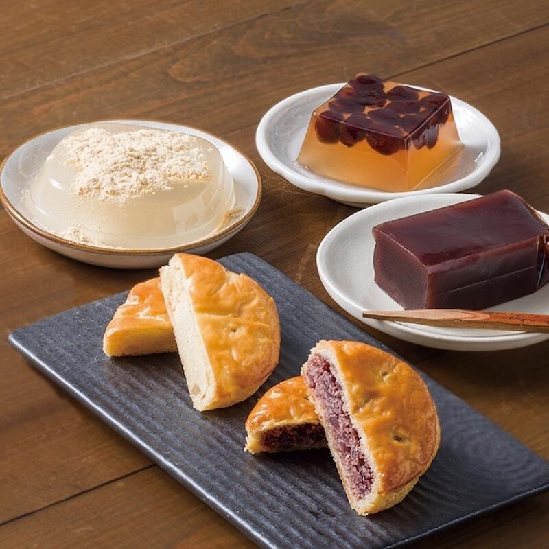 小豆餡、さつまいも餡、くり餡それぞれの餡を幾重にも折ったパイ生地で包み焼き上げた「パイまんじゅう」。昔ながらの製法にて練り上げた羊羹。技術に伝統の良さを加え、一品一品心を込めて作り上げた和菓子の詰め合わせです。